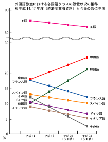外国語教室の各国言語の取り扱い率の推移と今後の予測値です(平成14,17年度のデータは経済産業省の発表による、平成20、23年度のデータは前回増減からの推測値)。