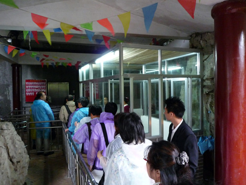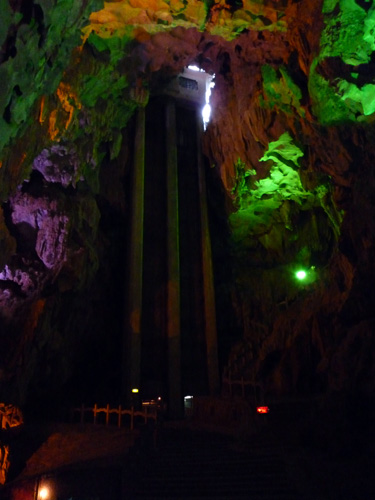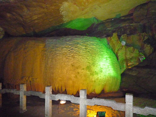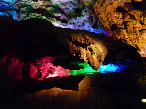 ▲なぜかやたらとカラフルな照明!普通の照明でいいのにと観光客の皆さん。確かに中国の観光地らしい演出ですよね(苦笑)。もう少し自然色の照明で自然のすごさを感じたいものです。でも中はかなり広くて雄大、オススメです。